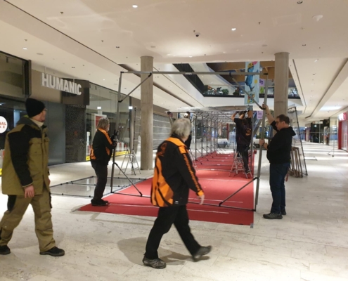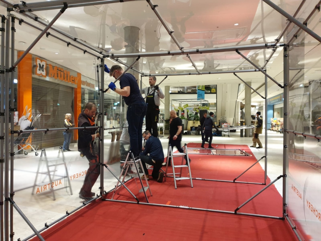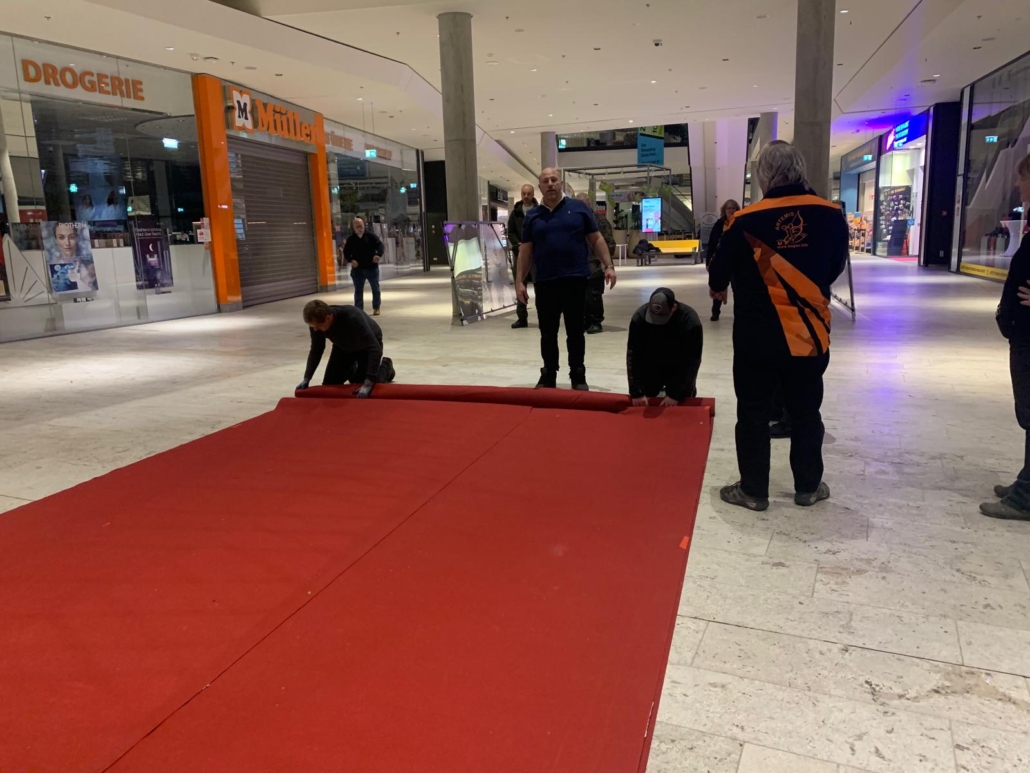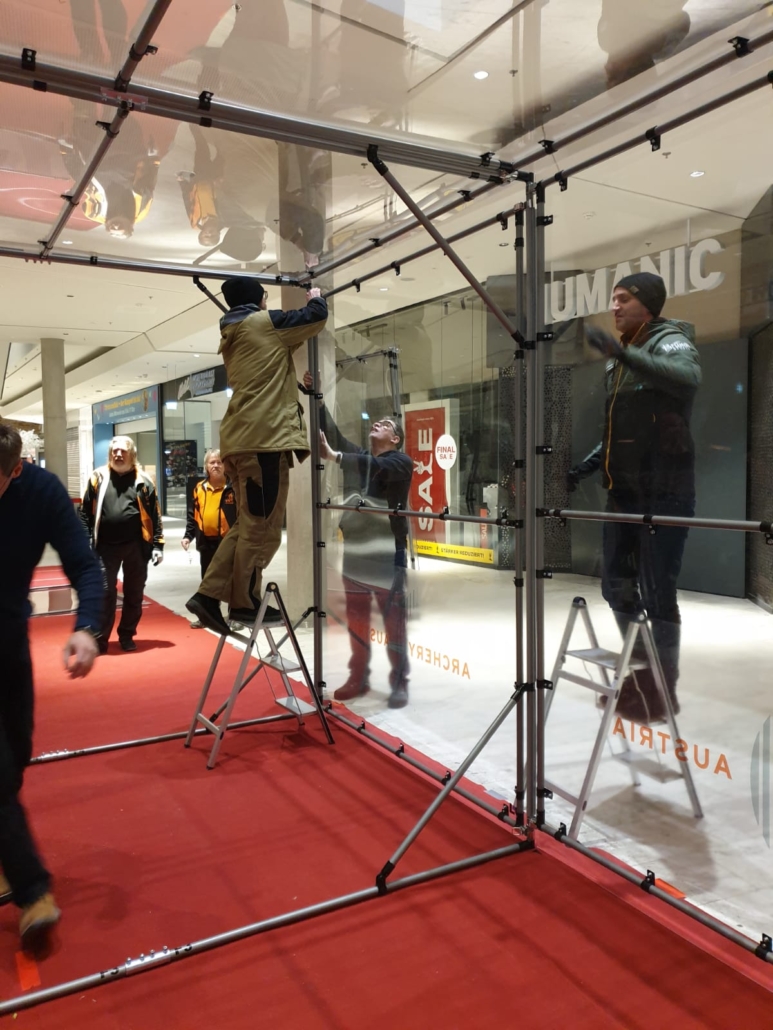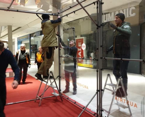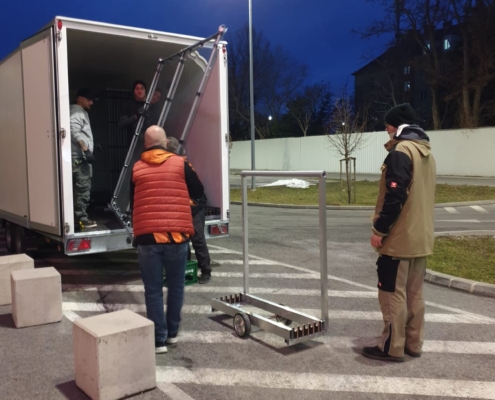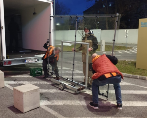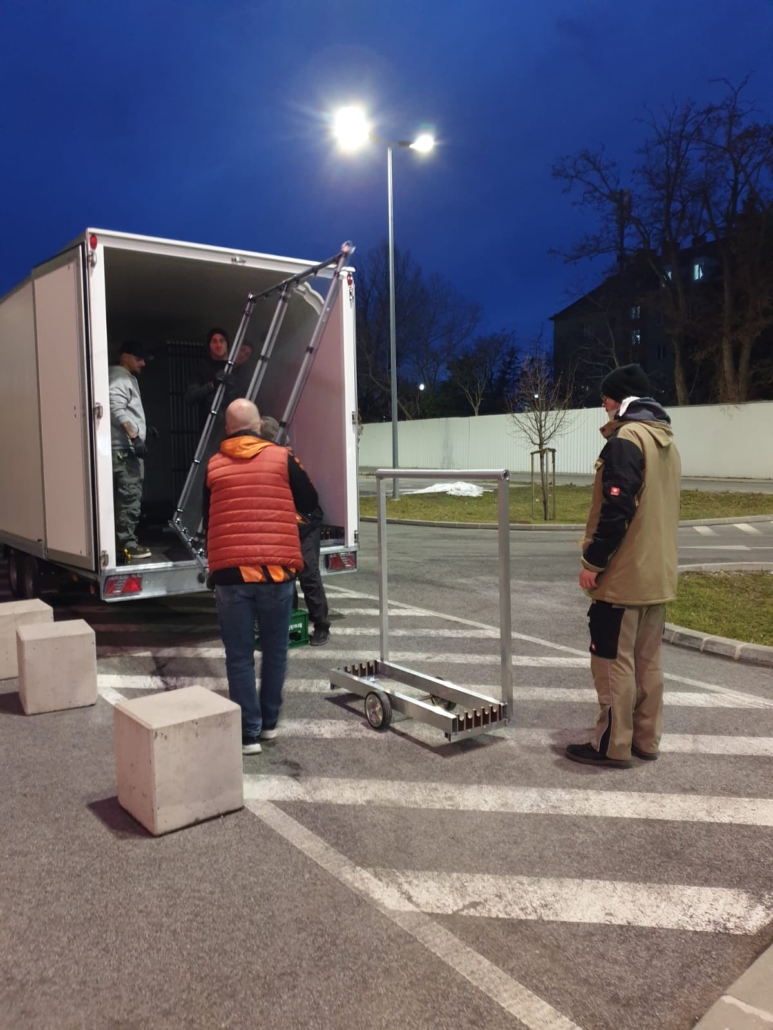 Zehn freiwillige Helferinnen und Helfer treffen sich am Lade-Parkplatz des Huma Eleven in Simmering. Vor Ort wartet bereits Michael Müller, der Sportdirektor des ÖBSV. Nach einer kurzen Begrüßung geht es hinein ins Warme. Durch einen langen Gang erreicht das Team den Aufstellungsort des ÖBSV-Schießkanals. Zwei ÖBSV-Helfer sind schon eifrig bei der Arbeit. Der rote Teppich, der als Unterlage für den Kanal dient, liegt bereits am Boden, und der Elektroanschluss wird gerade montiert.