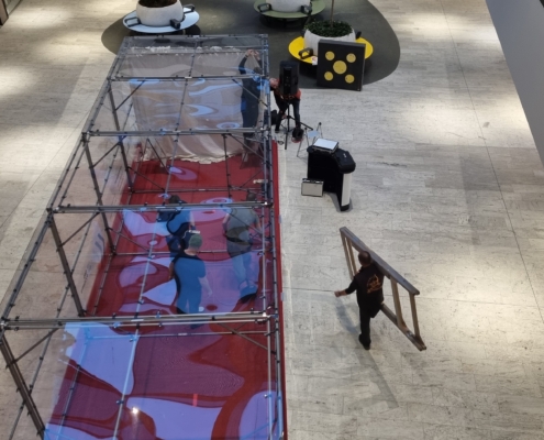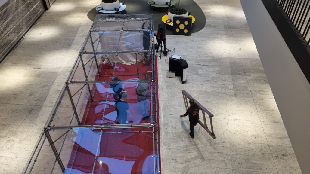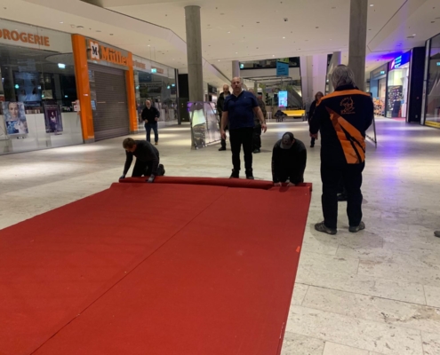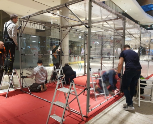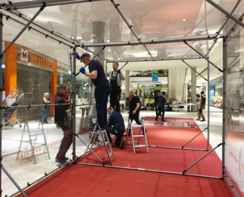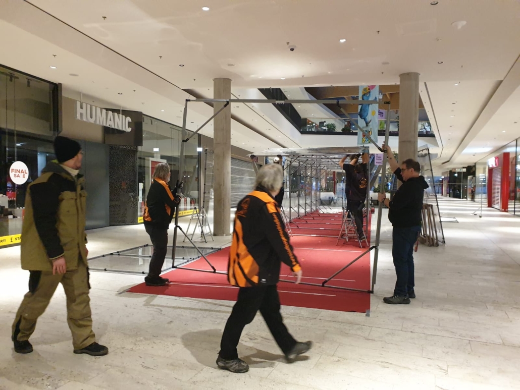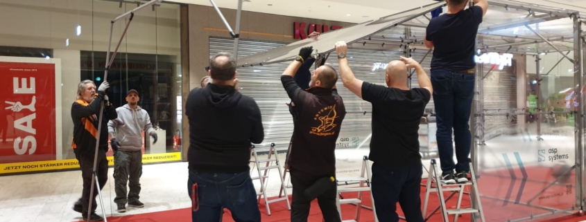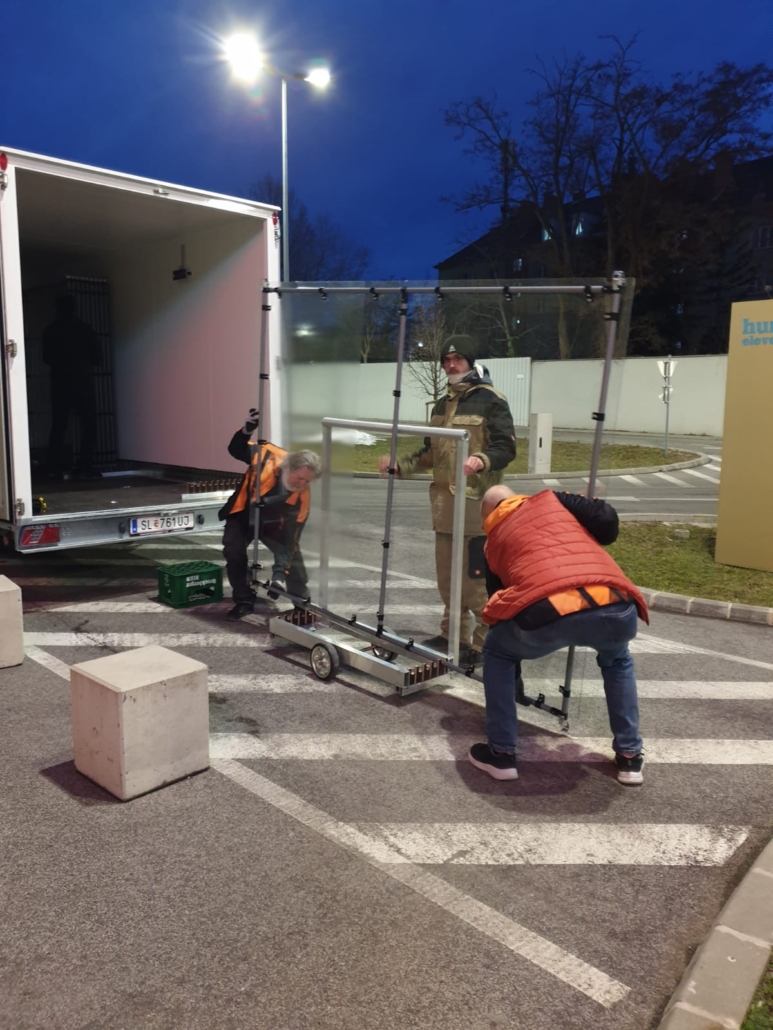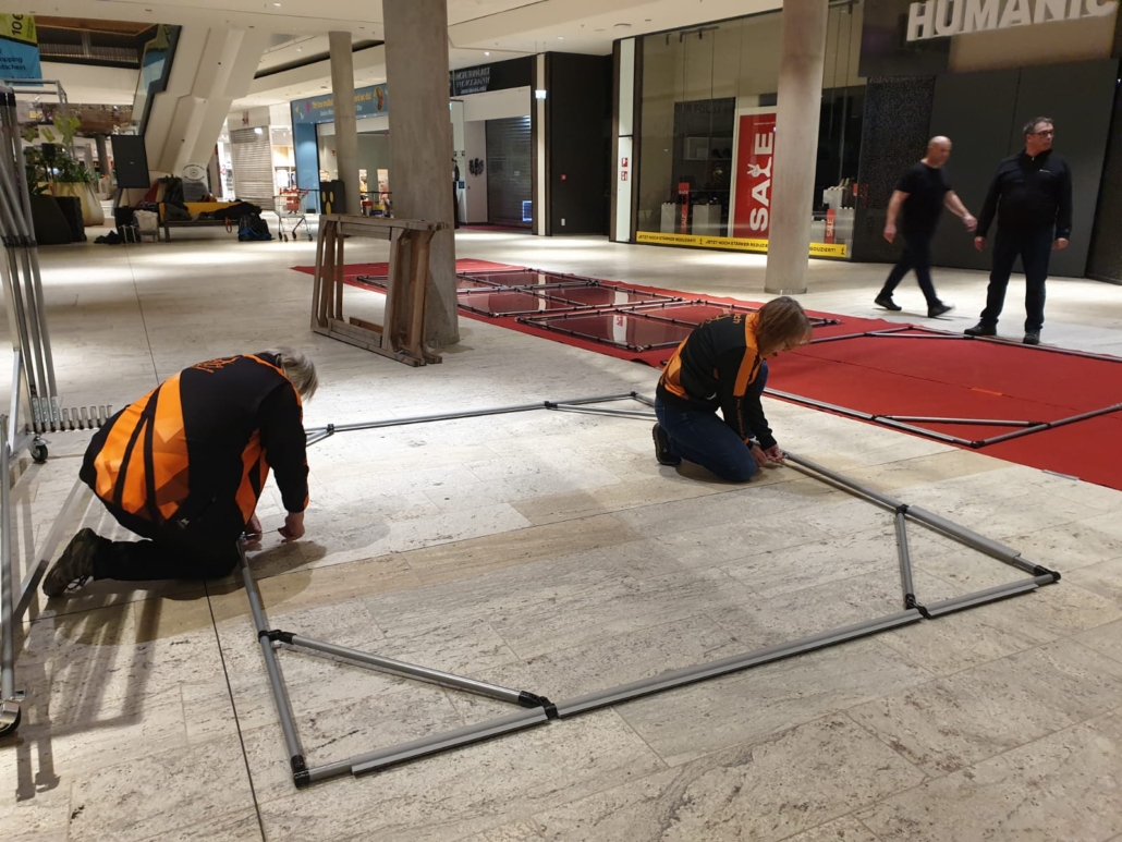 Zehn freiwillige Helferinnen und Helfer treffen sich am Lade-Parkplatz des Huma Eleven in Simmering. Vor Ort wartet bereits Michael Müller, der Sportdirektor des ÖBSV. Nach einer kurzen Begrüßung geht es hinein ins Warme. Durch einen langen Gang erreicht das Team den Aufstellungsort des ÖBSV-Schießkanals. Zwei ÖBSV-Helfer sind schon eifrig bei der Arbeit. Der rote Teppich, der als Unterlage für den Kanal dient, liegt bereits am Boden, und der Elektroanschluss wird gerade montiert.