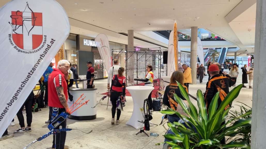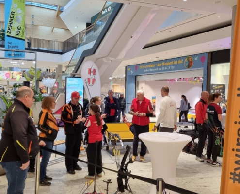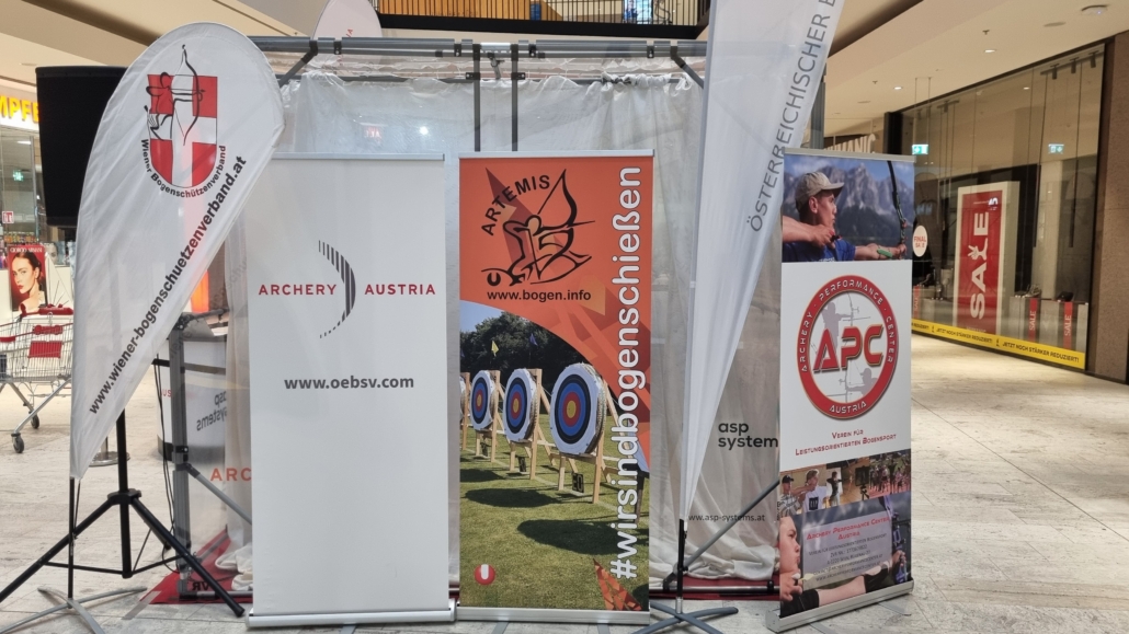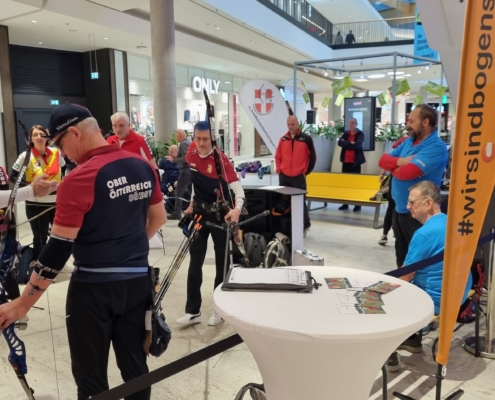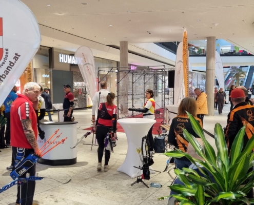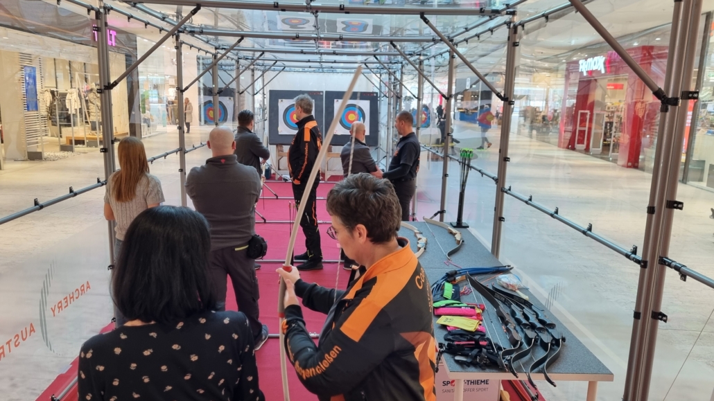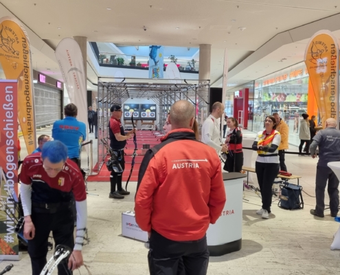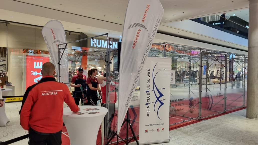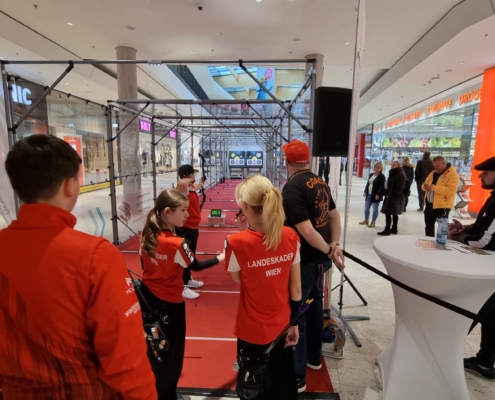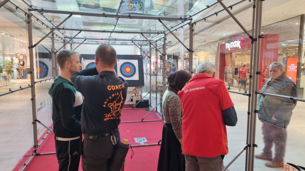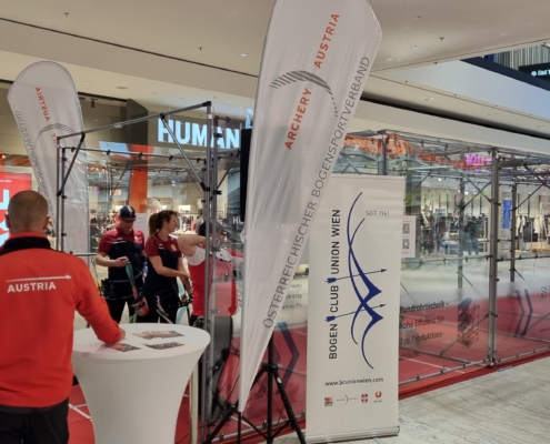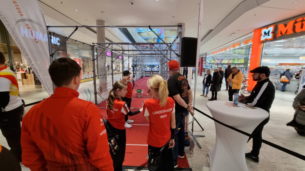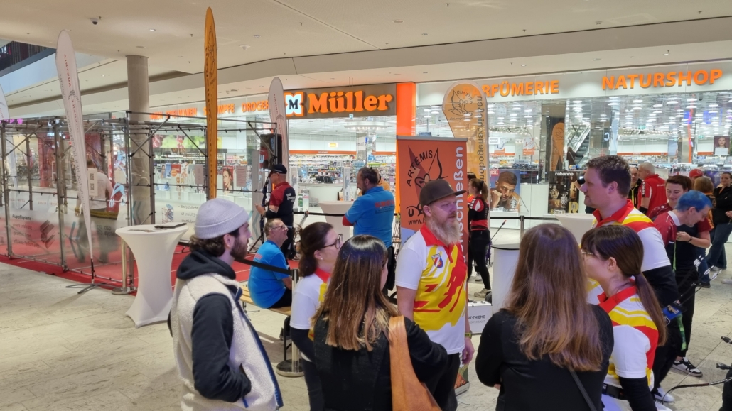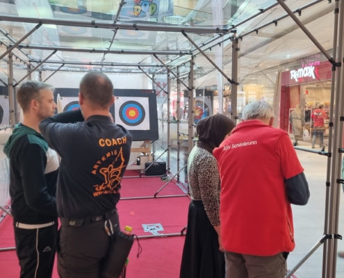 Inzwischen war es 8:00 Uhr, und weitere Helferinnen und Coaches trafen ein. Gemeinsam wurden die restlichen Materialien aufgebaut: ÖBSV-Theken, Beachflags und diverses Werbematerial aus den Wiener Vereinen. Punkt 9:00 Uhr begann das Publikumsschießen im Schießkanal. Vormittags standen sieben Coaches zur Verfügung, nachmittags neun, dazu weitere Helfer für „Dies und Das“.