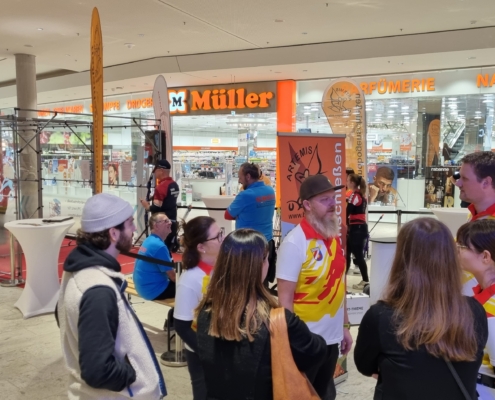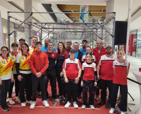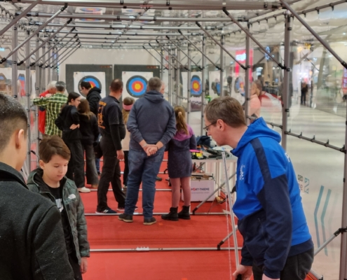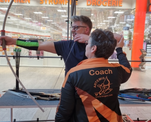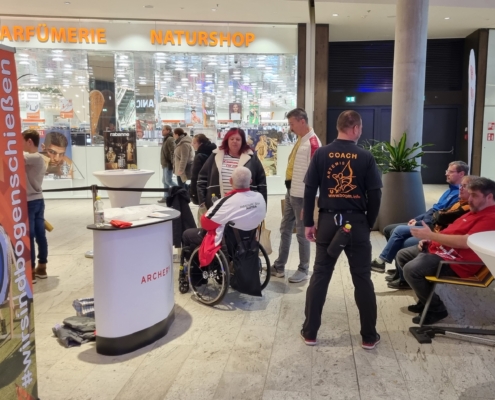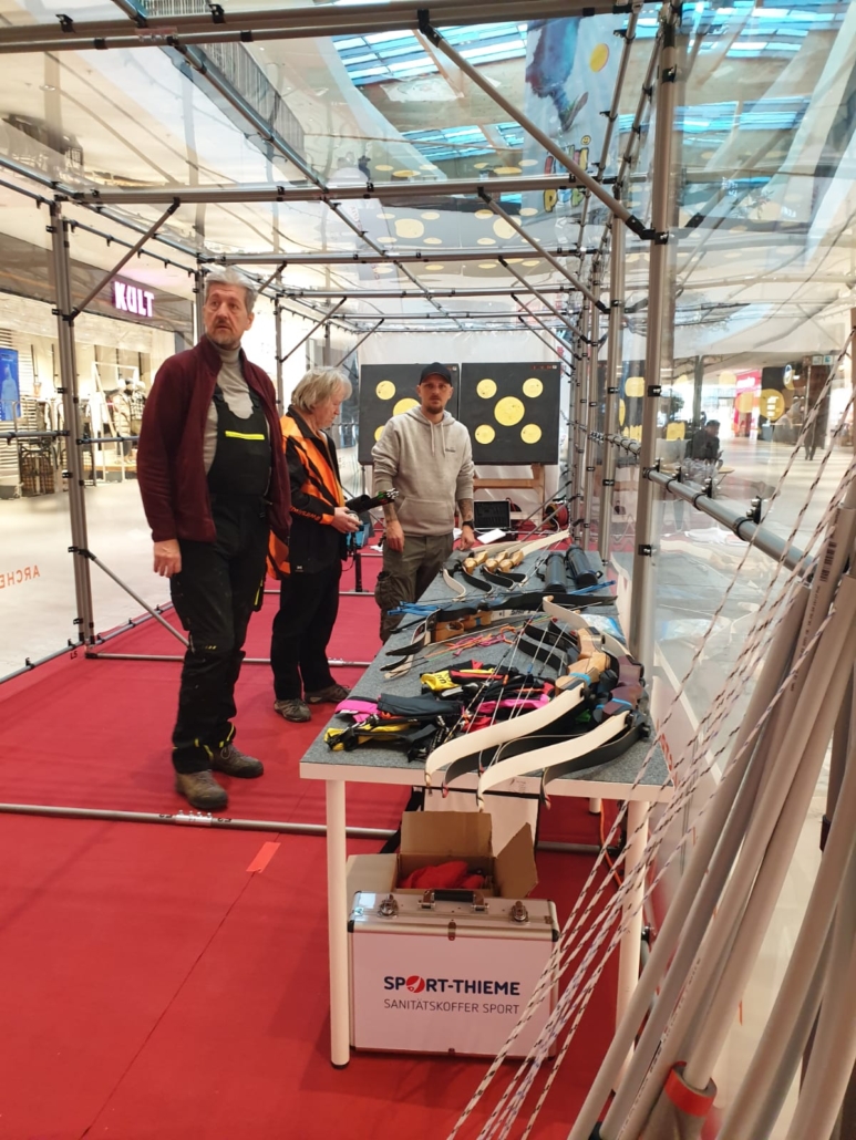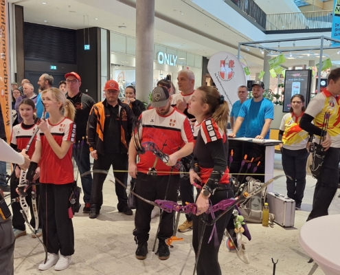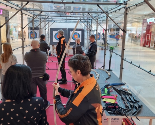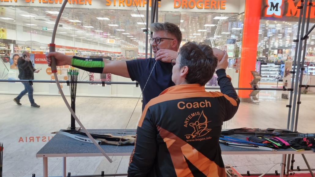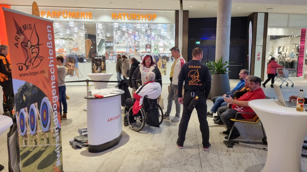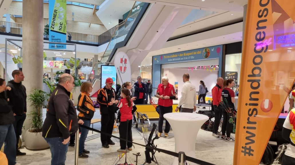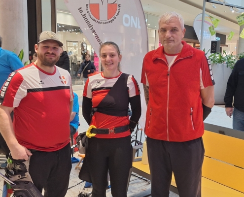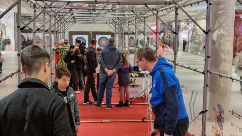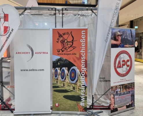 Inzwischen war es 8:00 Uhr, und weitere Helferinnen und Coaches trafen ein. Gemeinsam wurden die restlichen Materialien aufgebaut: ÖBSV-Theken, Beachflags und diverses Werbematerial aus den Wiener Vereinen. Punkt 9:00 Uhr begann das Publikumsschießen im Schießkanal. Vormittags standen sieben Coaches zur Verfügung, nachmittags neun, dazu weitere Helfer für „Dies und Das“.