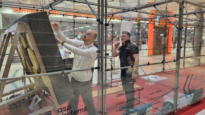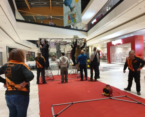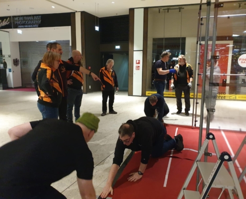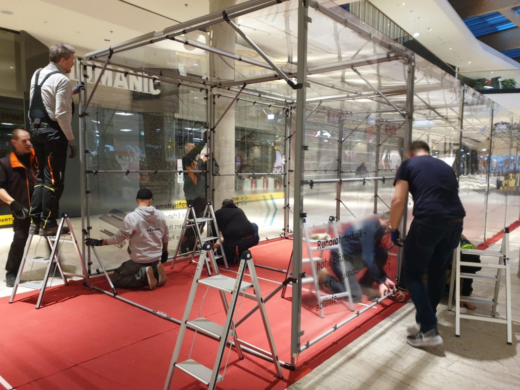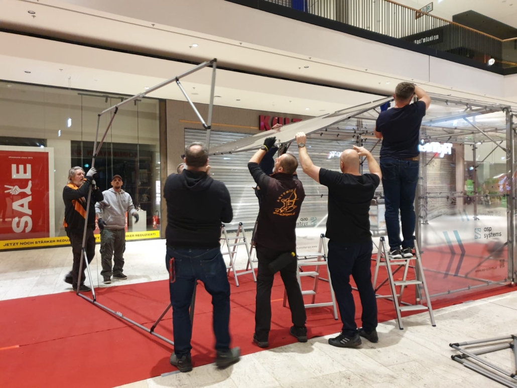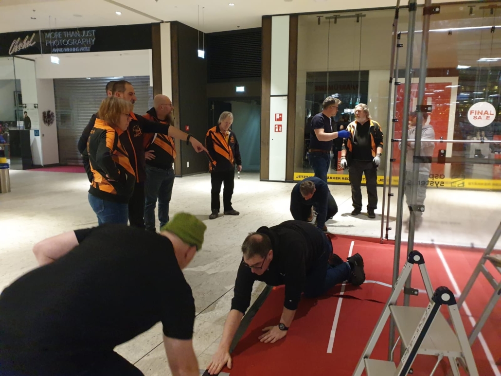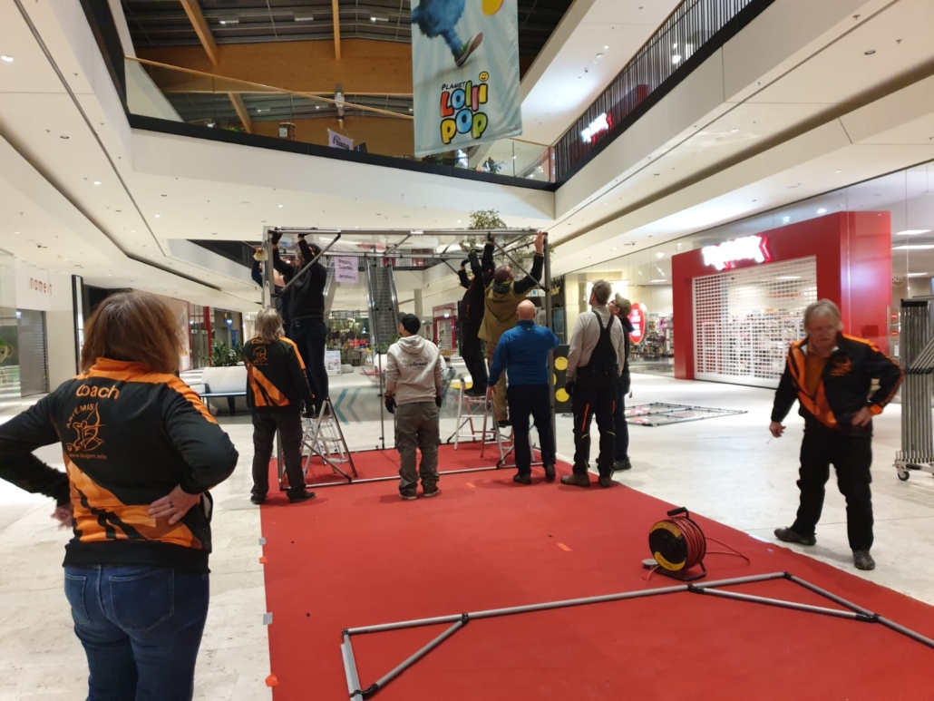 Michael Müller übernimmt die Leitung und schlägt vor, verschiedene Arbeitsgruppen zu bilden, wobei er die jeweiligen Aufgaben und Anforderungen erklärt. Kurz darauf stehen die Teams fest: ein Rahmen-Schrauber-Team, eine Gruppe, die schwere Teile des Schießkanals vom großen Anhänger am Parkplatz ablädt, und eine weitere Gruppe, die diese Teile auf Transportwagen verlädt und ins Einkaufszentrum bringt – alles in mehreren Etappen.