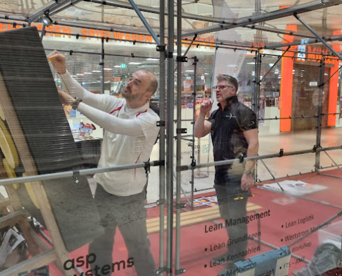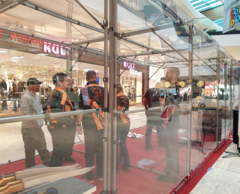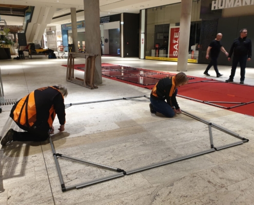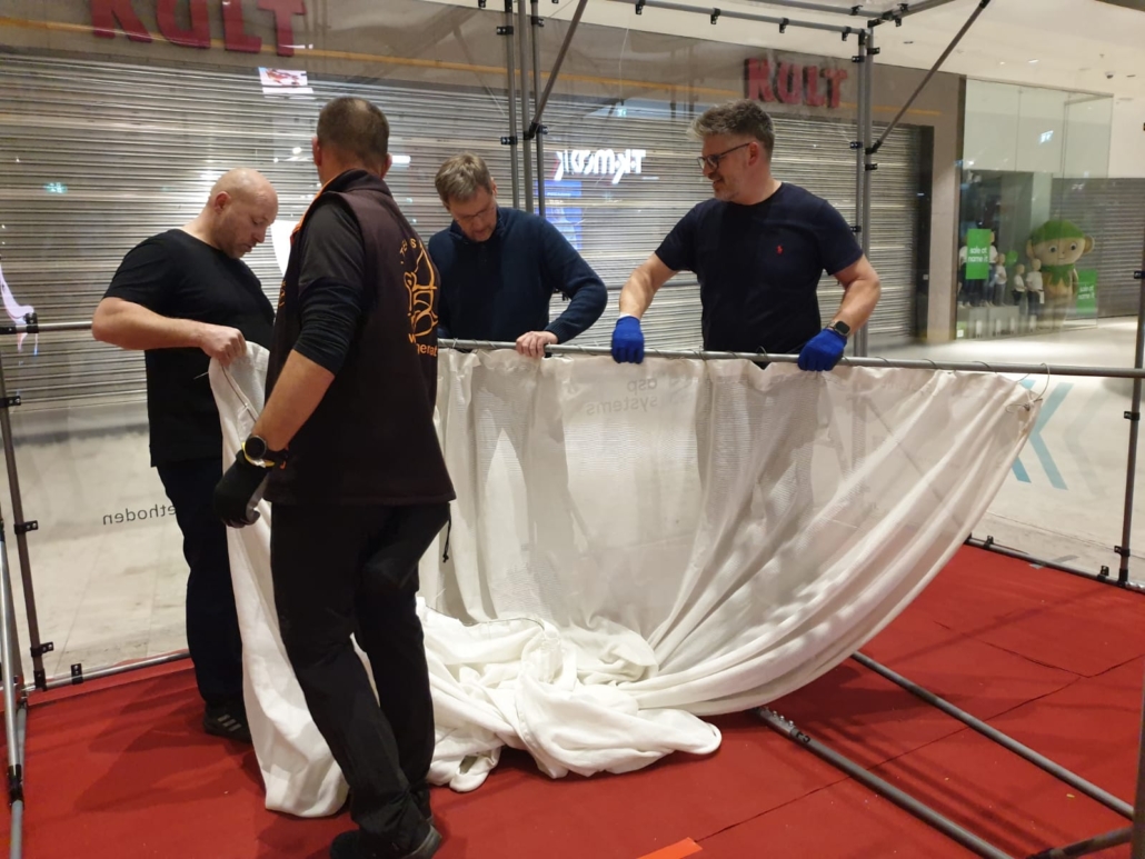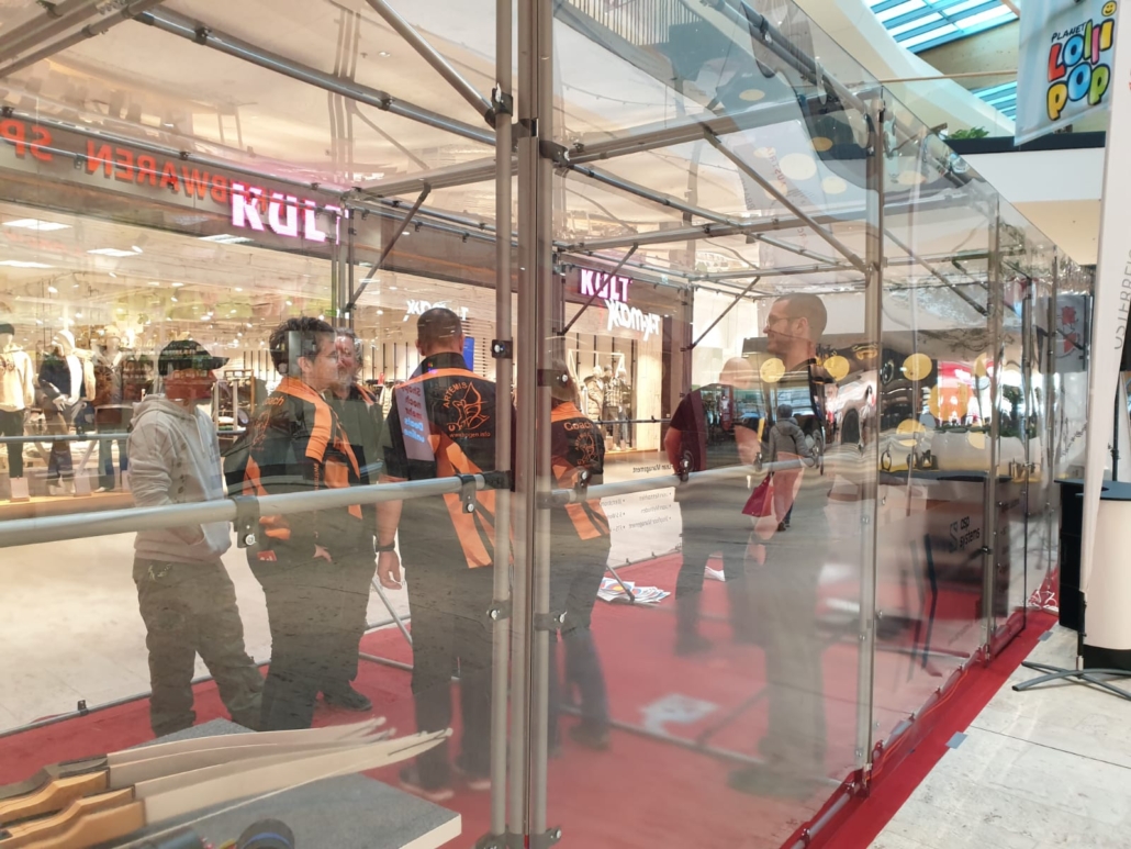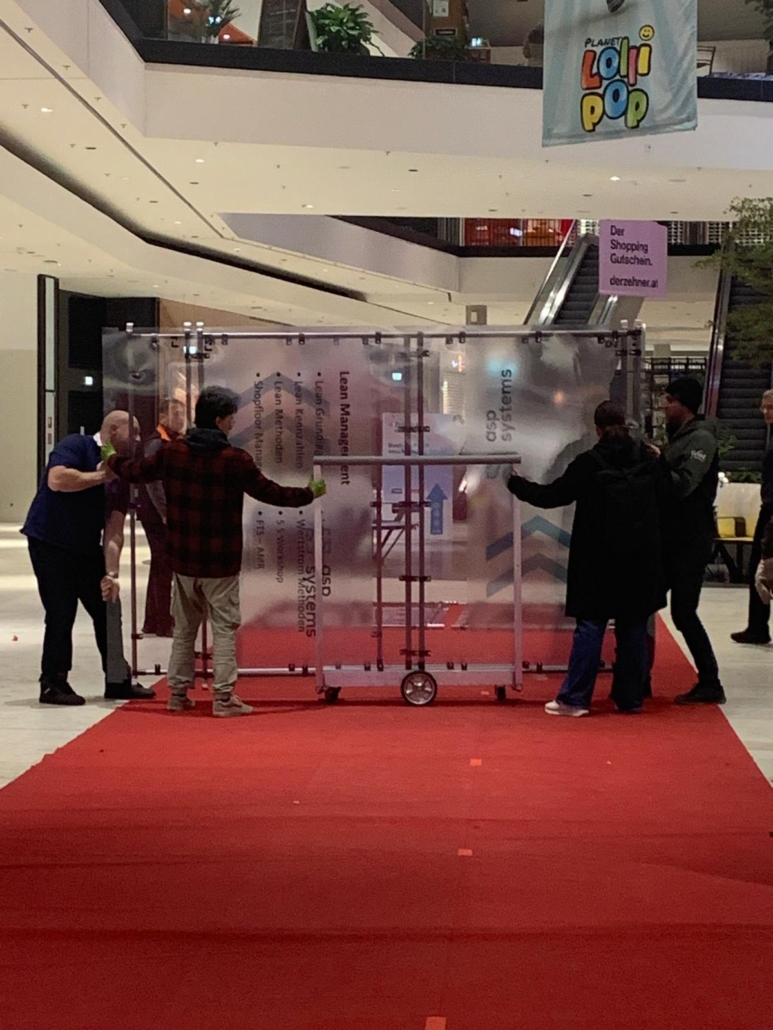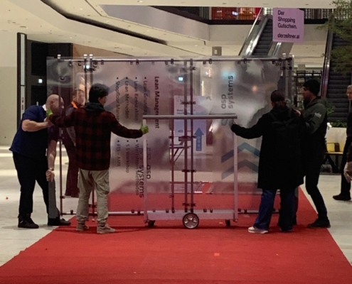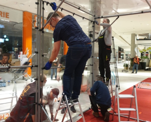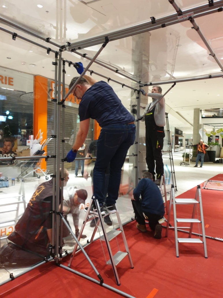 Michael Müller übernimmt die Leitung und schlägt vor, verschiedene Arbeitsgruppen zu bilden, wobei er die jeweiligen Aufgaben und Anforderungen erklärt. Kurz darauf stehen die Teams fest: ein Rahmen-Schrauber-Team, eine Gruppe, die schwere Teile des Schießkanals vom großen Anhänger am Parkplatz ablädt, und eine weitere Gruppe, die diese Teile auf Transportwagen verlädt und ins Einkaufszentrum bringt – alles in mehreren Etappen.