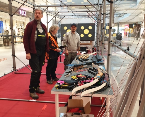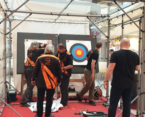 Nach einer kurzen Kaffeepause ging es weiter. Der Teppich wurde gesaugt, Scheibenständer zusammengebaut und aufgestellt, Dämpfer montiert und darauf wiederum Auflagen befestigt. Auf vorbereiteten Tischen wurden Eventbögen, Armschoner und Pfeile übersichtlich bereitgelegt.